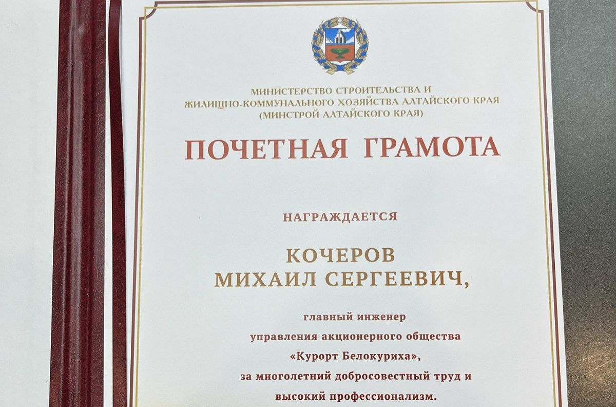 Главному инженеру АО «Курорт Белокуриха» вручили почетную грамоту краевого Минстроя