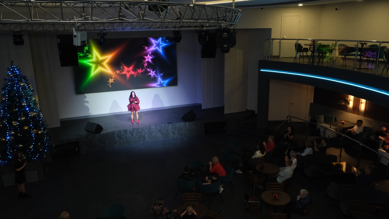 Помещение разделено на несколько функциональных зон. На первом этаже основная посадка гостей для комфортного просмотра фильмов и концертов. На втором этаже находится интерактивно-игровая зона и караоке. Она предназначена для активного отдыха и развлечений. Значительно изменили бар и диджейскую, с учетом современных требований к звуковому оборудованию.