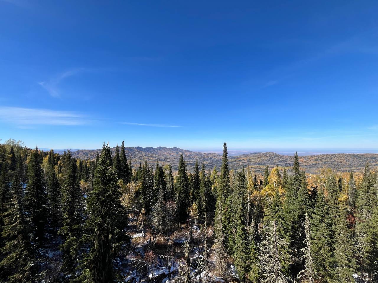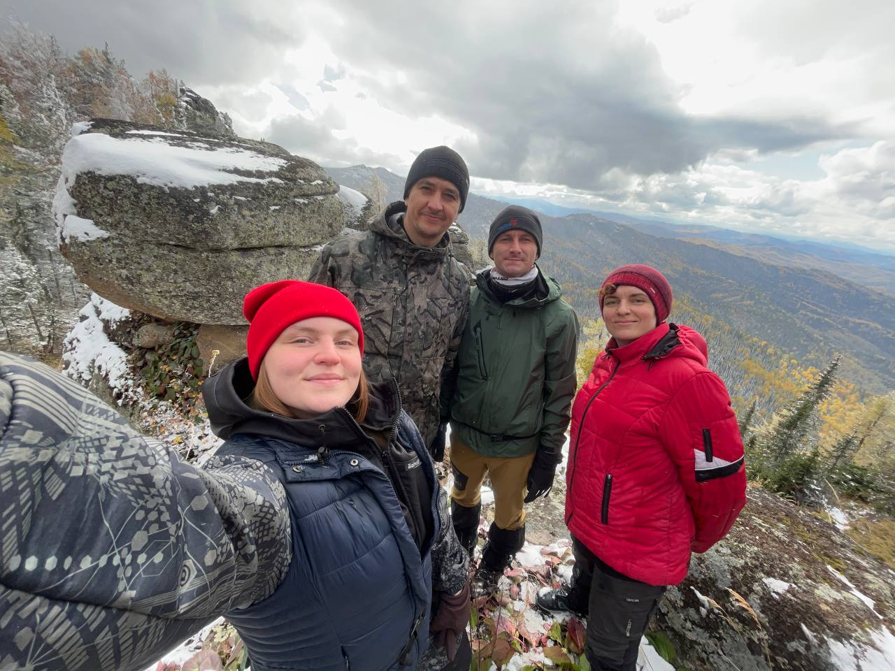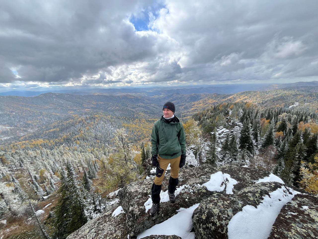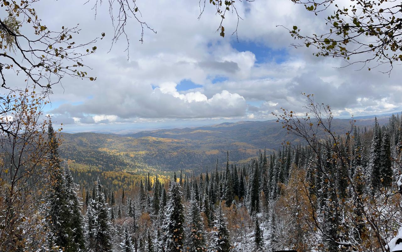 Стартанули мы от управления «Курорт Белокуриха». До первой точки проехали чуть больше 20 км. Там сделали «небольшую разминку» — поднялись на гору «Сухая Грива» — размяться и осмотреться. В День туризма, 27 сентября шел снег. Он образовал белую пелену, из-за которой не видно было ничего дальше нескольких десятков метров. До обзорной площадки на вершине мы прошли около 200 метров.