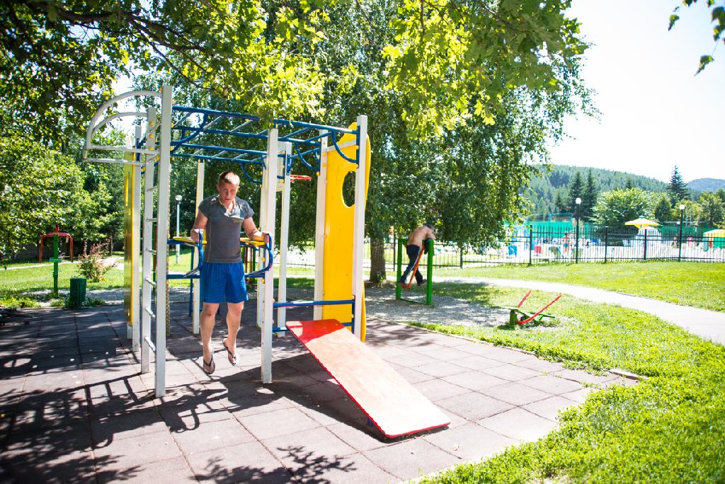 Спортивную тему продолжает ряд уличных тренажеров. Конечно, в санатории «Белокуриха» есть целый комплекс крытых спортзалов. Но занятия на свежем воздухе — это отдельное удовольствие