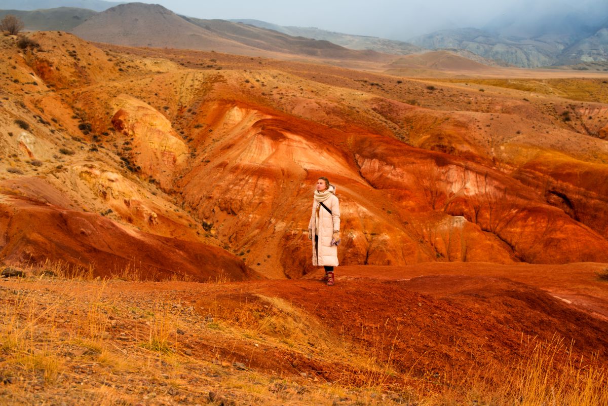 Грунтовая дорога постепенно приобретает красноватый оттенок и вот перед нами открываются Кызыл-Чин (Красное ущелье), Кызыл-Таш — все это радужные горы республики Алтай, известные нам, как марсовы поля. Цветовая гамма этого неповторимого горного рельефа создает впечатление пребывания на другой планете. Красный, охра, желтый, фиолетовый, белый — эти оттенки пейзажу придал марганец, хром, рутил. Цветные полоски складываются одна на другую горизонтальными слоями. Каждый слой формировался в отдельный период и условия того периода влияли на окраску глины. На разноцветных горах остались следы работы ветра и талых вод.