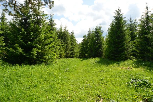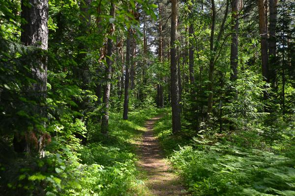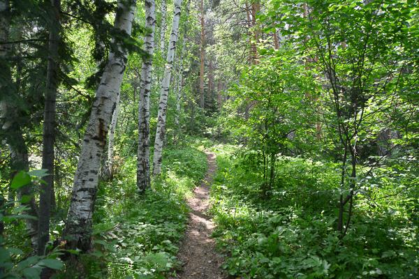 Тропинка идет в лес, временами ровная, временами с довольно крутым подъемом. Хорошая тренировка для всего организма.  Березы сменяют ели, ели — кустарники.