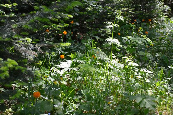Огненно-яркие цветы, которые растут в лесу — жарки, занесены в Красную Книгу как исчезающий вид. Здесь они встречаются повсюду.