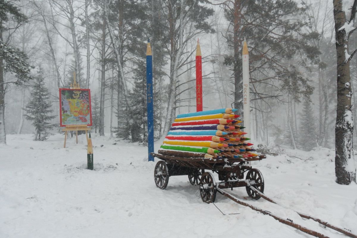 Встречают гостей персонажи сказок Льюиса Кэрролла, на поляне художника кто-то позабыл старую телегу с цветными карандашами, за «Андреевской слободой» представители галактики «Кин-дза-дза» приземлили свой космический корабль «Пепелац», неподалеку установлена самодвижущаяся телега – плюкмобиль и трицикл полицейского с планеты Плюк. Отсюда можно отправиться в гости к хозяину тайги — на Мишину гору.