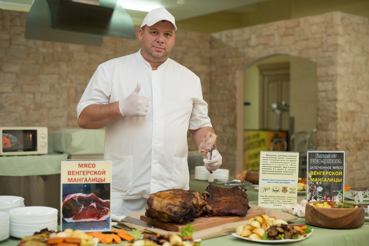 — Мы имеем большое собственное хозяйство, животные питаются и растут в экологически чистом районе. Среди них есть уникальная порода кудрявых свиней — венгерская мангалица. И в этот раз наши повара угощали гостей этим удивительным диетическим мясом. Наверняка многие из вас зададут вопрос: «Как свинина может быть диетической?». А вот и может. Это особенная порода кудрявых свиней, которая питается исключительно травой, кореньями, сеном с алтайских лугов. Эту породу относят к категории «деликатесная». Мясо отличается особой нежностью, сочностью, благодаря содержанию тонких слоев жира даже в вырезке. Во время приготовления он растворяется, чем объясняется его нежная и сочная структура, — объяснила Анна.