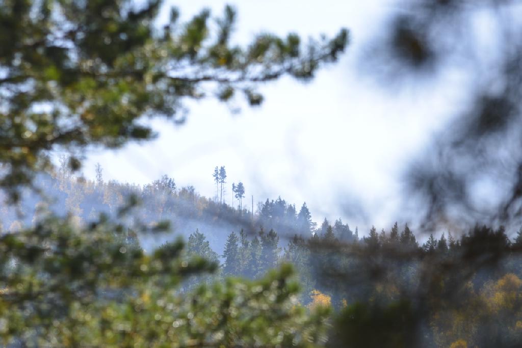Вторая остановка — небольшое плато, откуда открывается вид на горы, они не полностью золотые,  вперемешку. А вокруг — дымка от солнечного света. Классно!