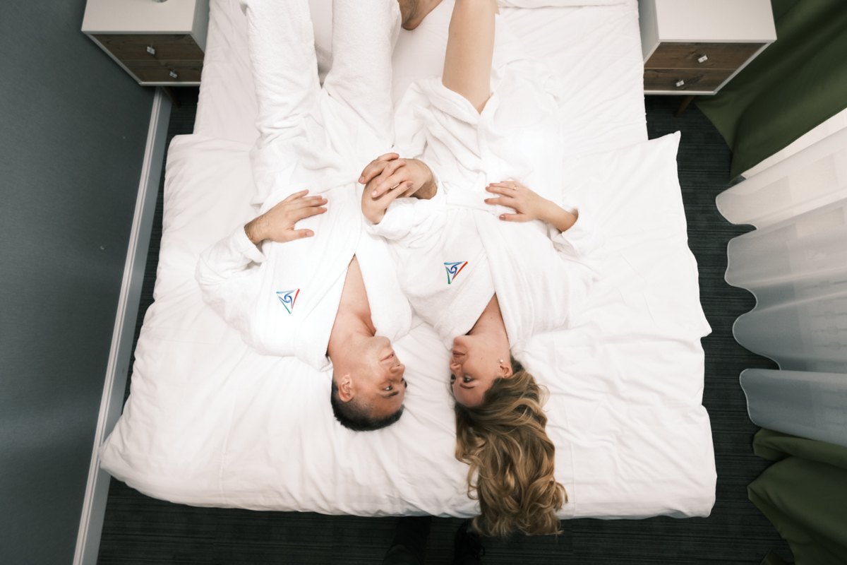 Для тех, кто собирается приехать с любимым человеком — идеально подойдут номера категорий «Семейный комфорт» или «Престиж». Первый – компактный и уютный, где есть самое необходимое для двоих. Второй — относится к номерам повышенной комфортности, что отражено в интерьере, площади номера и наборе услуг, входящих в пакет. Также гостям, остановившимся здесь, доступны премиальные услуги: специальные программы лечения и питание в зале премиум.